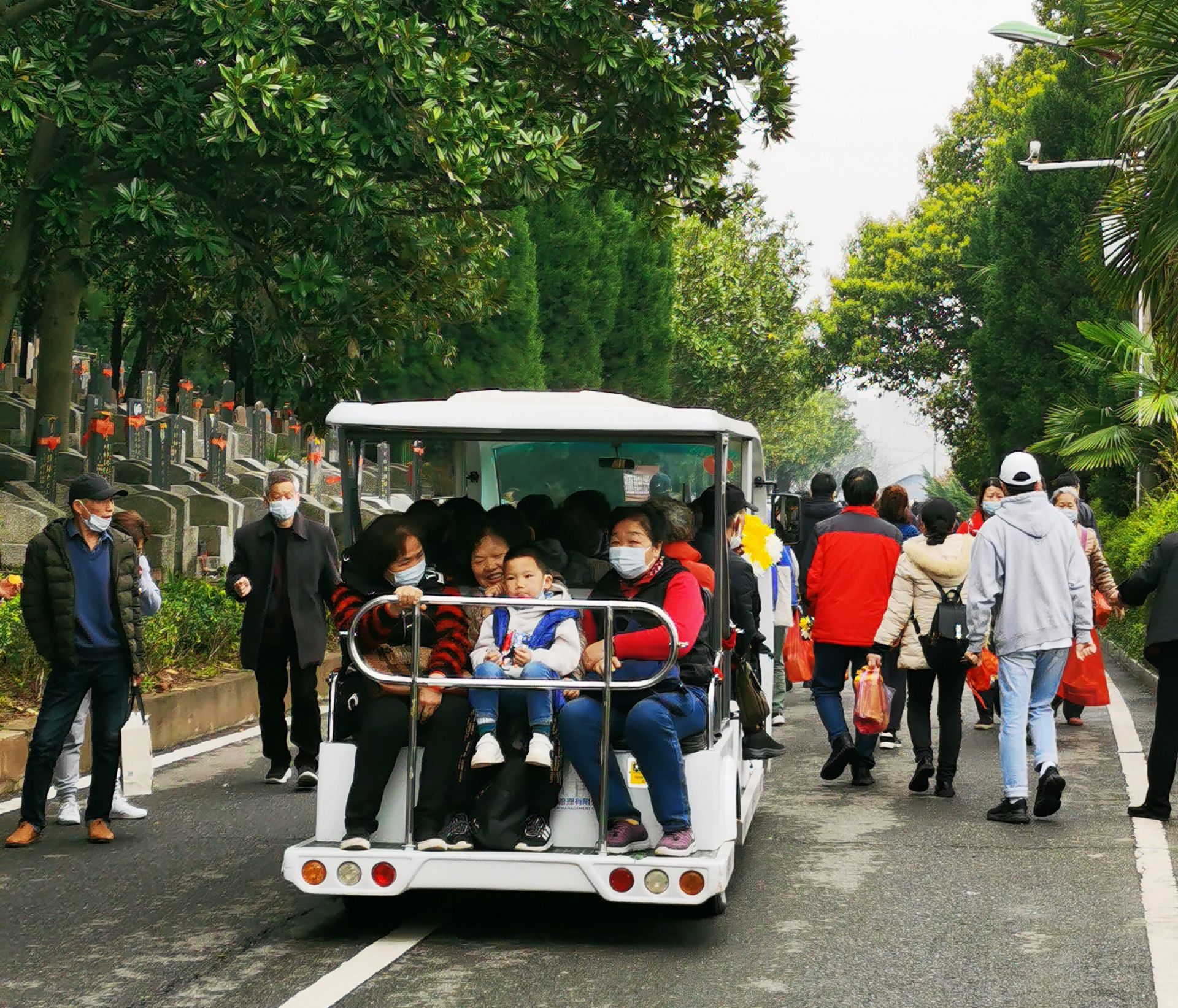 扁担山公墓是中心城区最大的公墓之一,环山一圈有2.5千米,为了方面老人和小孩以及有需求的市民祭祀,扁担山公墓为祭祀市民提供了免费乘车祭祀服务(高峰期除外)。“清明前夕,我们提前准备了6台新能源电瓶车,每台电瓶车可以乘坐14人,免费电瓶车非常受市民青睐。”陈婷说。