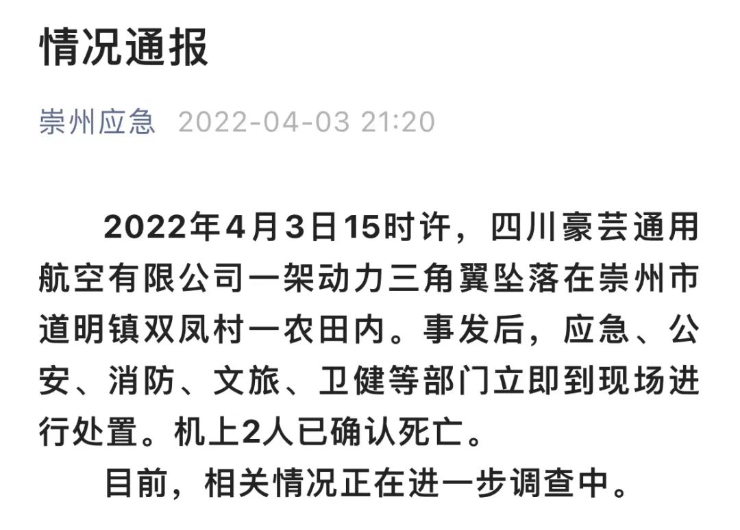 据崇州应急微信公众号消息,2022年4月3日15时许,四川豪芸通用航空有限公司一架动力三角翼坠落在崇州市道明镇双凤村一农田内。