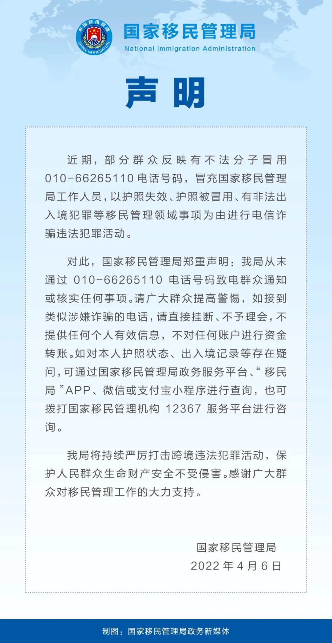 对此,国家移民管理局郑重声明:该局从未通过010-66265110电话号码致电群众通知或核实任何事项。请广大群众提高警惕,如接到类似涉嫌诈骗的电话,请直接挂断、不予理会,不提供任何个人有效信息,不对任何账户进行资金转账。如对本人护照状态、出入境记录等存在疑问,可以通过国家移民管理局政务服务平台、“移民局”APP、微信或支付宝小程序进行查询,也可以拨打国家移民管理机构12367服务平台进行咨询。