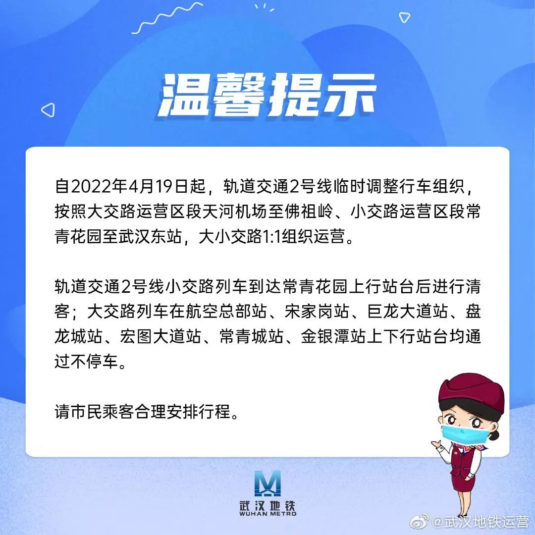 自2022年4月19日起,轨道交通2号线临时调整行车组织,按照大交路运营区段天河机场至佛祖岭、小交路运营区段常青花园至武汉东站,大小交路1:1组织运营。