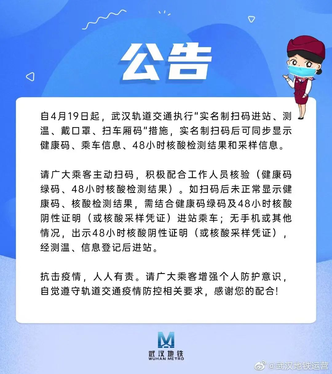 自4月19日起,武汉轨道交通执行“实名制扫码进站、测温、戴口罩、扫车厢码”措施,实名制扫码后可同步显示健康码、乘车信息、48小时核酸检测结果和采样信息。
