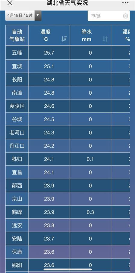 全省来看,刚过去的这股冷空气给鄂西部分高山地区送去了雪花,不过冷空气不驻场,气温就得意飞扬起来:今日(18日)荆楚大地,暖意融融,下午3时,全省大部地区气温都跃过20℃线,最高是五峰的25.7℃,气温最低的利川也有17.4℃。