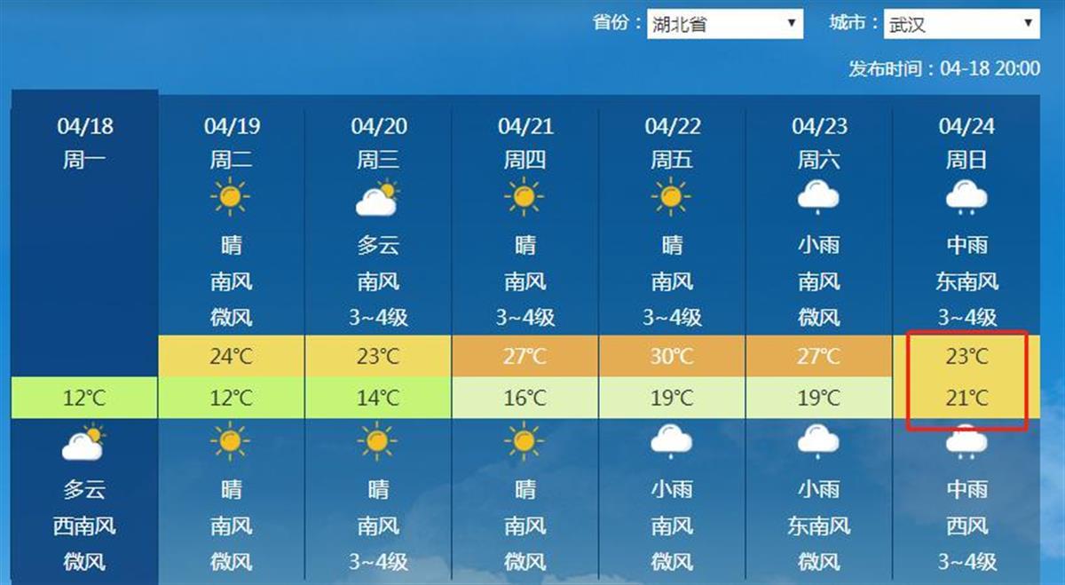 武汉周二到周四,晴天和多云之间切换,风向均为和暖的偏南风,周二周三高温均为25℃,周四偏南风更甚,达5级,高温再升至28℃,低温在12℃-14℃。