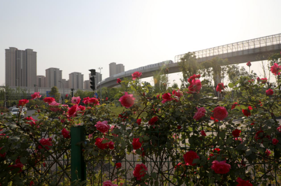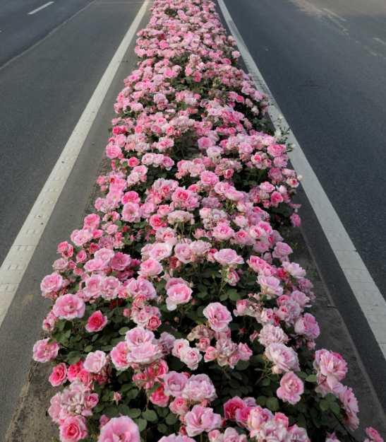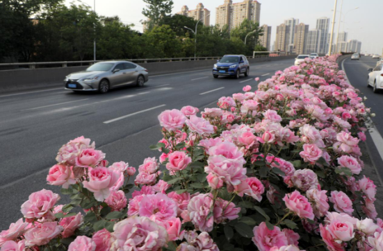 在白沙洲大道青菱高架上,数万株月季花把大道装扮成姹紫嫣红的“空中花廊”,驾车出行的市民打开车窗就能感受到芬芳扑鼻,沁入心脾。洪山区园林局在白沙洲大道上种植了“仙境”“莫海姆”“红从容”“黄从容”等四个品种的月季,橙黄、深红、橘红、粉红四种花色的月季为大道“绣上花边”,近看是彩色盘,远观是粉绸带,美不胜收,在这条武汉南北向的交通大动脉上妆点形成了一条色彩缤纷又独具特色的迎宾花带。
