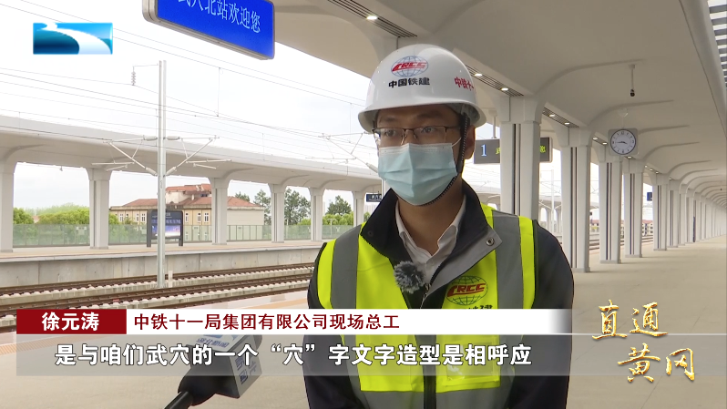 中铁十一局集团有限公司现场总工 徐元涛:“武穴北站的整个外立面造型,是与咱们武穴的一个穴字文字造型是相呼应;第二个是咱们的候车厅的吊顶。吊顶顶部是采用了咱们武穴市当地编织文化;第三点是咱们两侧山墙上面,是结合咱们武穴当地的一个港口文化以及山水特色,结合做出了一幅山水造型画。”