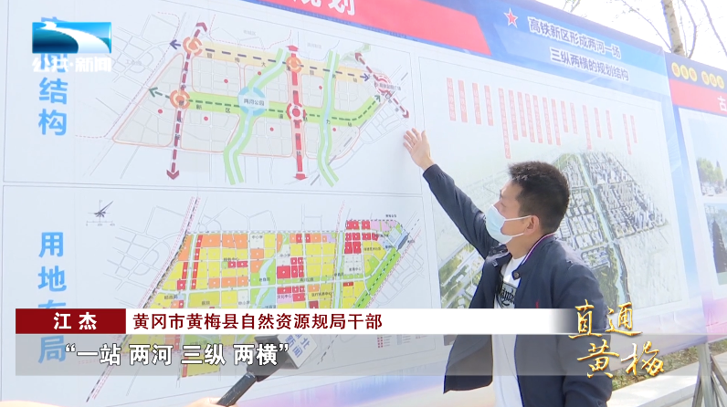黄冈市黄梅县自然资源规局干部 江杰:“这是我们高铁新区空间规划。整个高铁新区的规划结构是‘一站、两河、三纵、两横’,整个高铁新区的总用地面积11.63平方公里,我们高铁新区起步区的用地面积是3.02平方公里。”