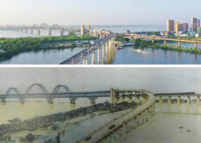 九江长江大桥两岸变迁今昔对比图。制作:通讯员 丁波
