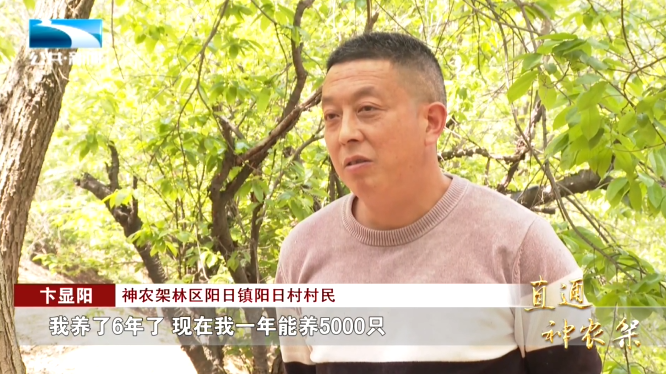 神农架林区阳日镇阳日村村民 卞显阳:“我养了6年了,现在我一年能养5000只,现在存栏的还有1000多只,一年赚上十万块钱。”