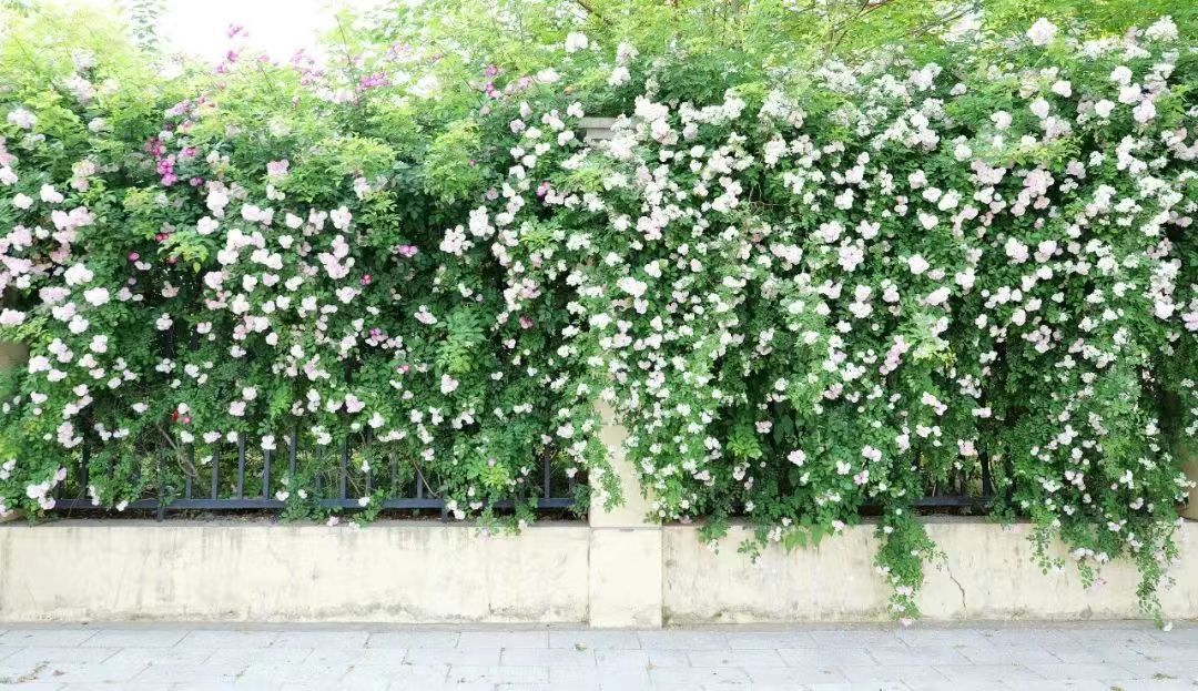 漫步街头,月季探出墙来,灿烂如霞。世茂希尔顿酒店对面和转角处,有一条百米藤本月季(蔷薇)花廊。满墙的白色、粉色月季交织在一起,随风摇曳,与晴川大道路边绿化带里的月季相映衬,温柔好看。