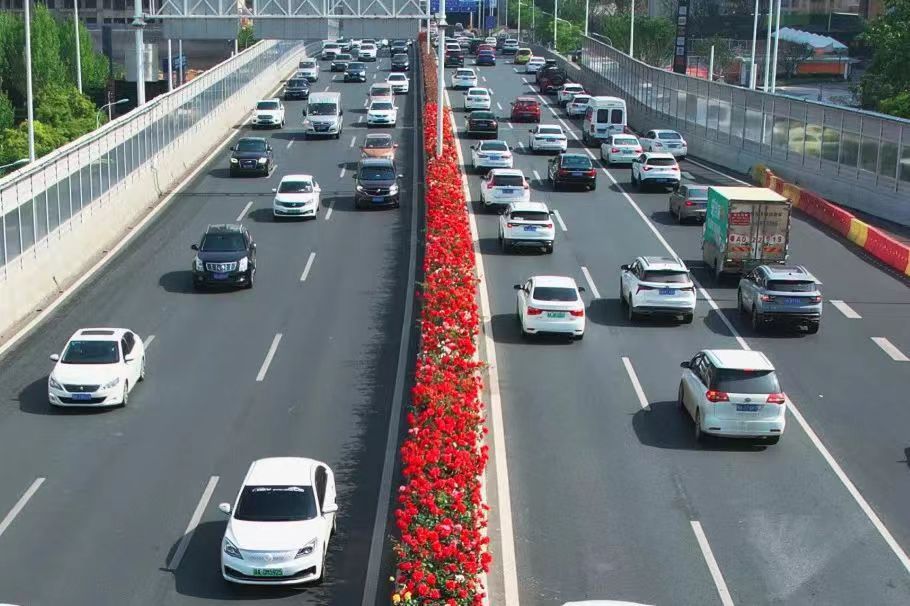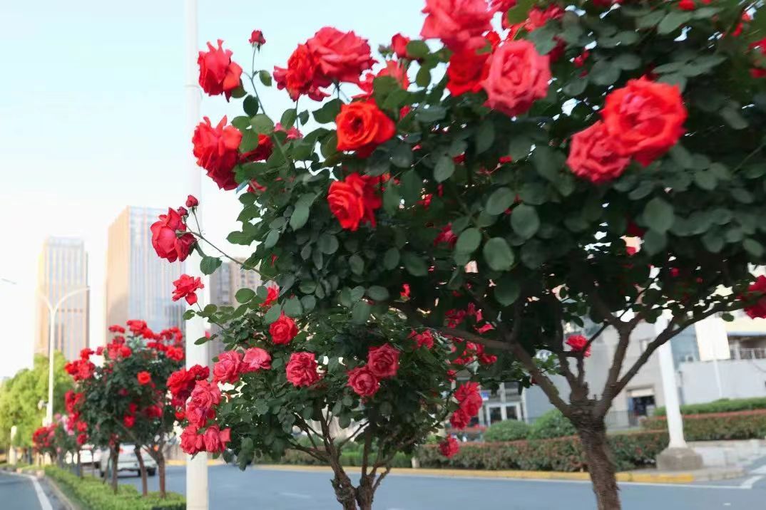 开车在路上,月季花一路迎送,在此等良辰美景前,堵车也变成“赏心乐事”。