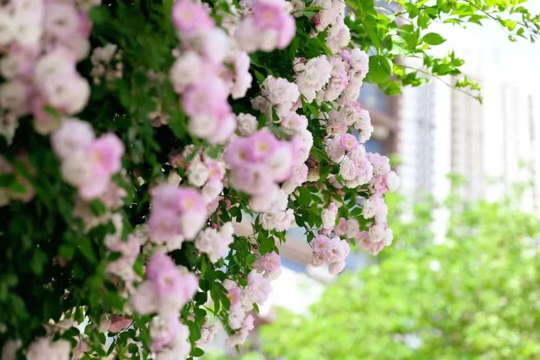 站在春天的尾巴迎接初夏,武汉市汉阳区5万多株月季在大街小巷盛开到“炸街”,甜甜的花香扑面而来。