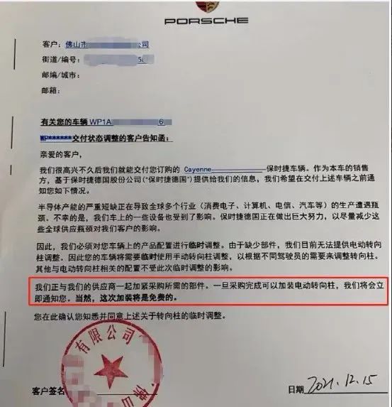 值得一提的是,保时捷当初事后免费升级电动转向柱的承诺,是与部分客户签署了正式文件。告知函中称,保时捷保证与供应商一起加紧采购所需部件。一旦采购完成可以加装电动转向柱,保时捷将立即通知车主进行免费加装。