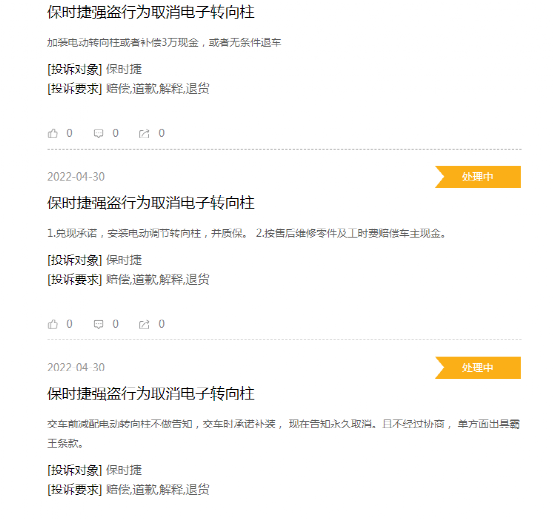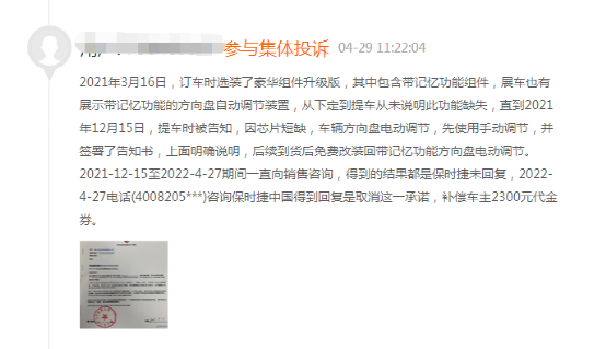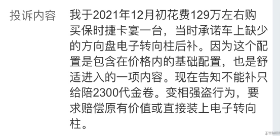 在黑猫投诉上,一位车主提到,自己是在2021年9月,于慈溪保时捷4S店订购了一辆卡宴。2022年3月,他在网上得知该车辆因全球芯片短缺影响,电动转向柱(即电动调节方向盘)改为了手动方向盘。跟400热线确认后问4S店,再三催促下才被告知厂家取消了该配件,改为补偿2300元的该店代金券,被他拒绝了,并要求4S店继续向保时捷反馈。