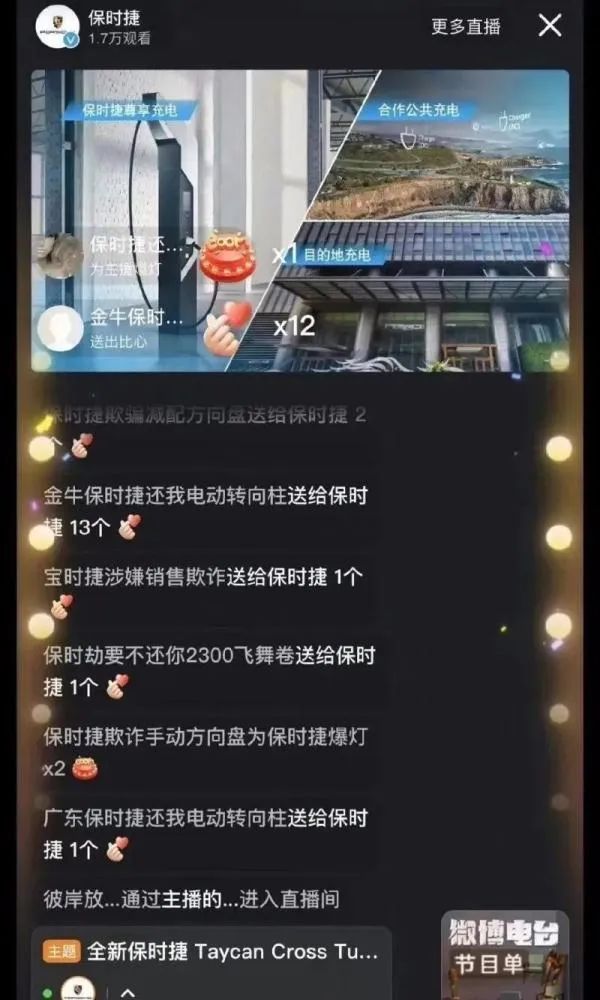 由于直播中未开启评论功能,这些车主纷纷改名为“保时捷涉嫌销售欺诈”、“保时捷还我电动转向柱”等名称,通过刷礼物的方式接力霸屏。