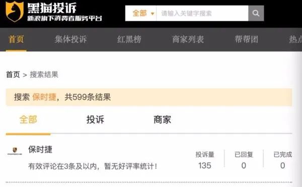 此外,据中国新闻周刊报道,在黑猫投诉平台上,保时捷累计共有135条投诉,其中有97条出现在最近30天内。对保时捷发起了集体投诉的车主,已达86位。