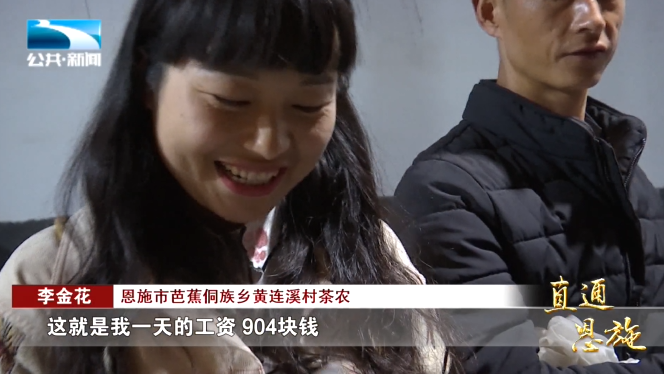 恩施市芭蕉侗族乡黄连溪村茶农 李金花:“这就是我一天的工资,904块钱。刚开始我也好害怕,我看前面几个人的茶都被退回去了,说他们摘得差 。”