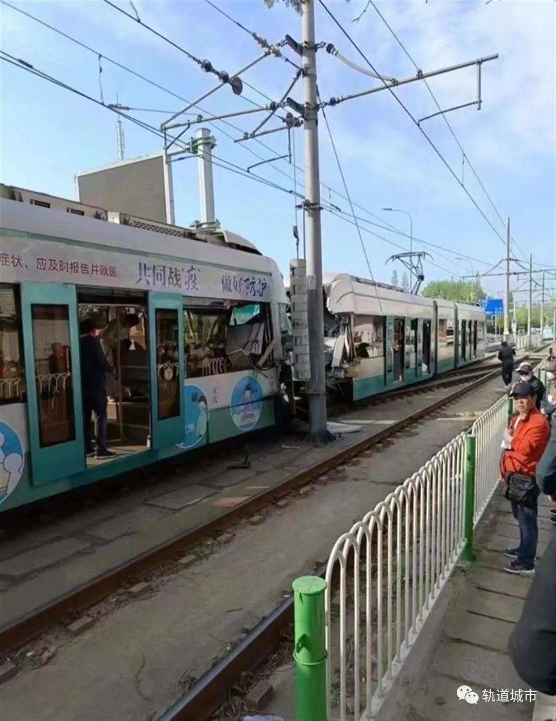 网上流传的视频和图片显示,两辆有轨电车停在轨道上,两辆车紧挨在一起,两车接触部分明显受损,有救援人员从一辆有轨电车内抬出一名受伤人员。