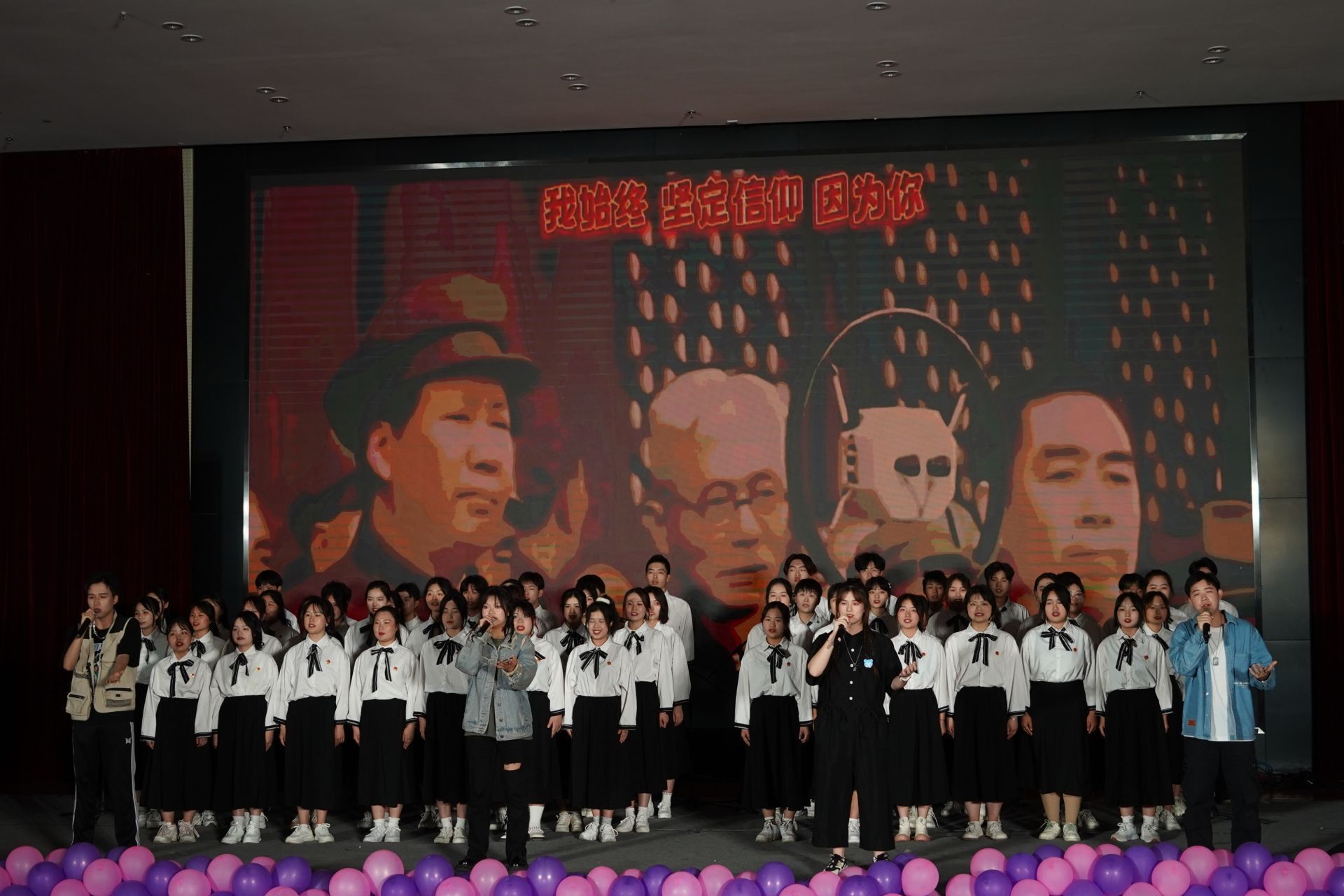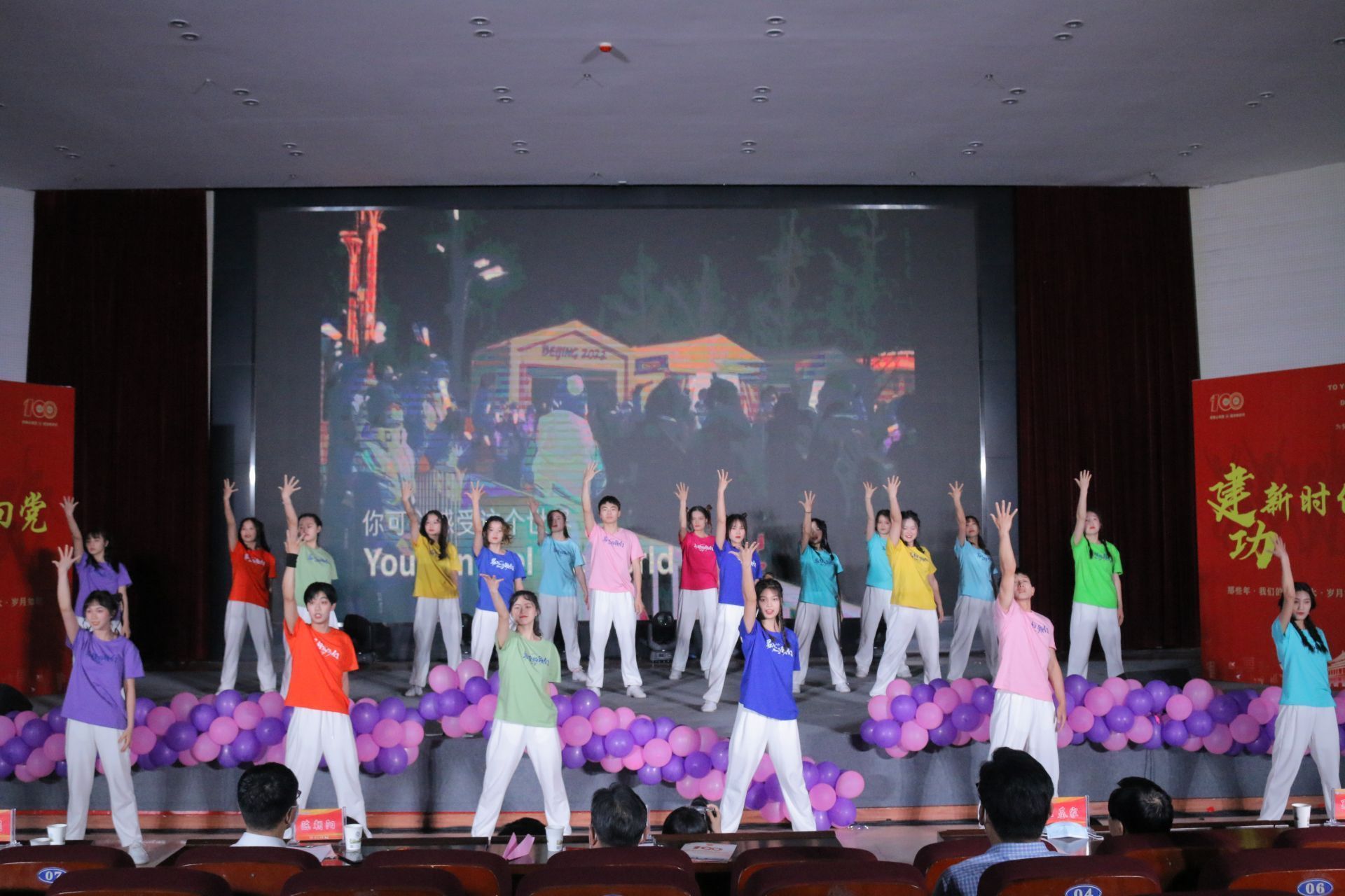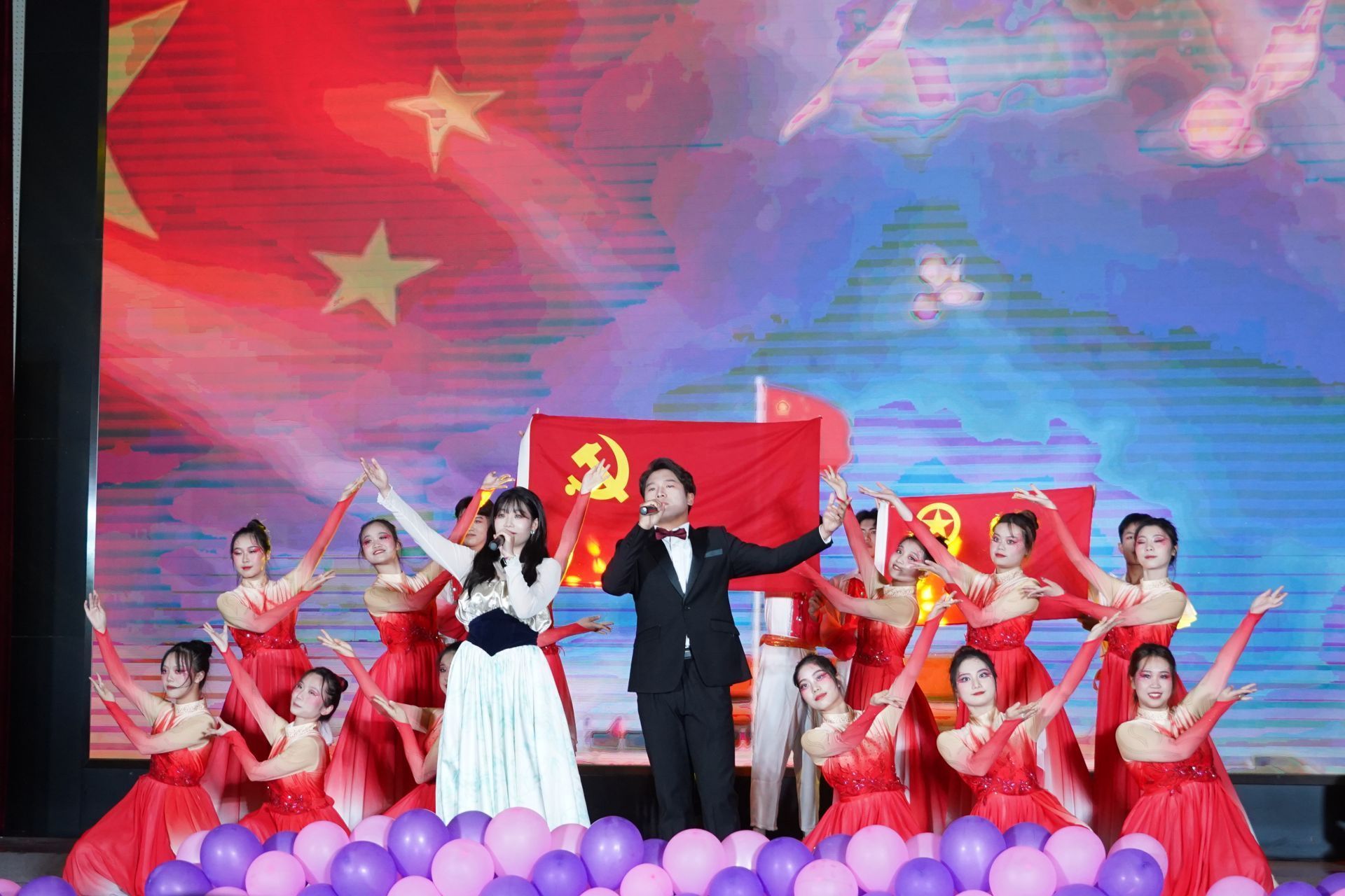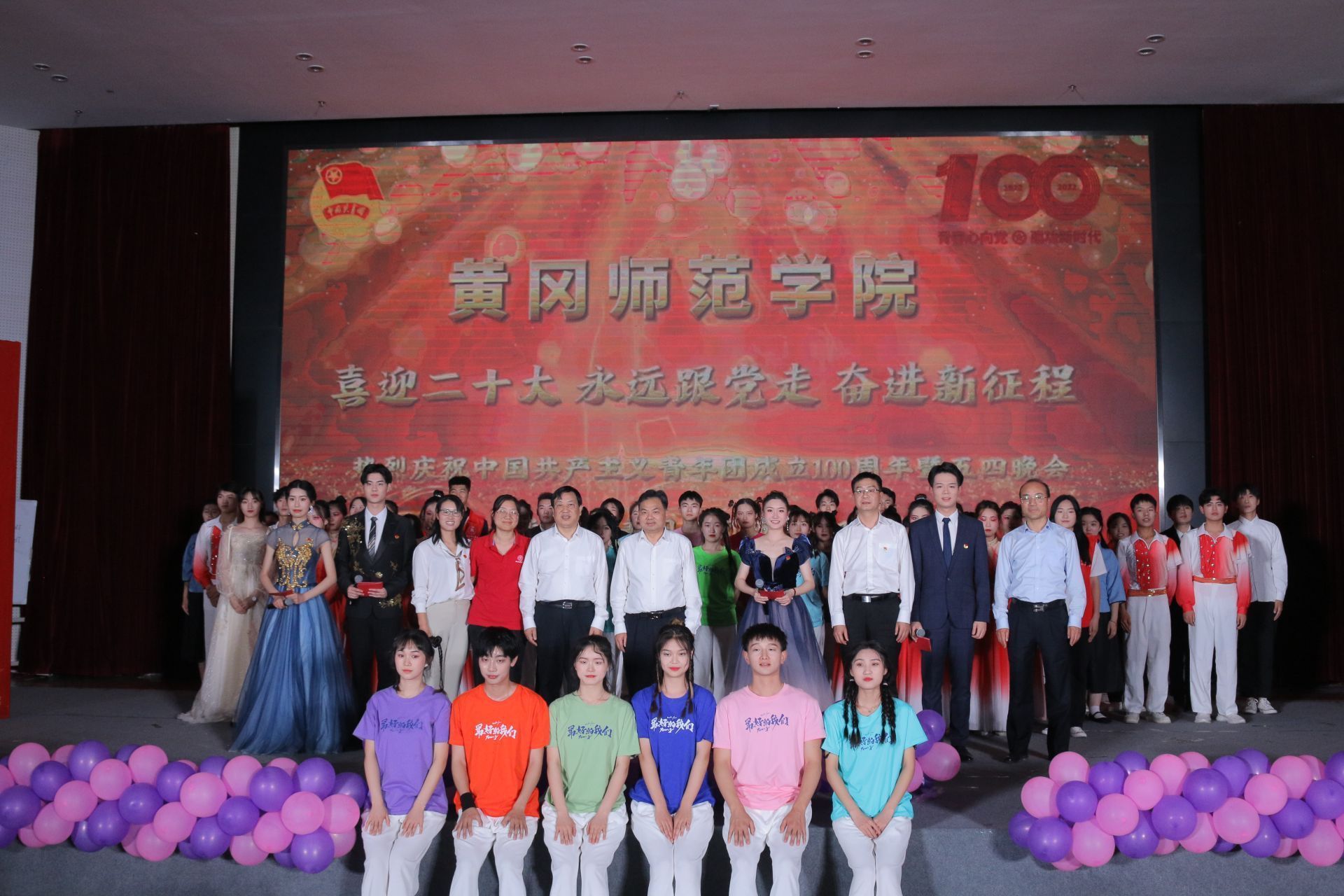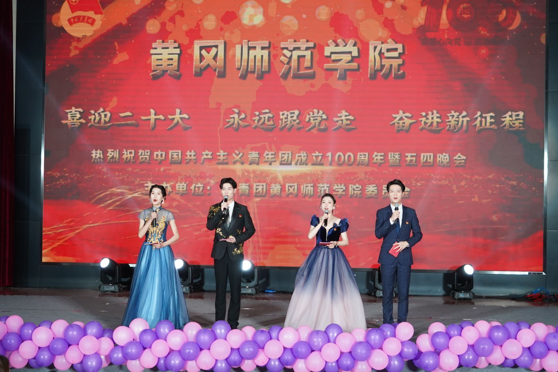 在舞狮表演的热闹喧腾与巴黎和会节选片段演绎的震撼中,晚会正式开始。本次晚会共分为忆往昔、峥嵘岁月稠,看今朝、旖旎风光秀,望未来、任重而道远三个篇章,以时间轴线串连起中国共产主义青年团的百年荣光。从团歌传唱和重温入团誓言到情景剧《聚青年之火,燃时代之光》,从歌曲《滚烫》到诗词新编《一百年华》,从《党旗飘扬的方向》到《我们的明天》(五四特别版),从舞蹈串烧《YOUNG》到《一起向未来》,整台晚会以庆祝中国共产主义青年团成立100周年为核心,以继承和发扬爱国、进步、民主、科学的五四爱国主义精神为主旨,弘扬共青团的优良传统,展现了一代代团员青年不忘初心、紧跟党走,担当起民族复兴重任,展示新一代青年团员朝气蓬勃、奋发进取的精神风貌。晚会也体现了黄冈师范学院青年积极向上的心态,高尚的审美追求,丰富了黄冈师范学院学子的校园文化生活,充分发挥了文化育人的功能,营造了浓郁的校园文化氛围。