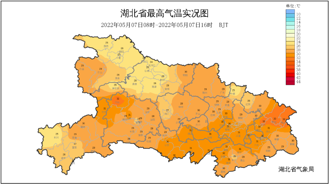 最高气温:鄂东南21~24℃;其他地区24~27℃