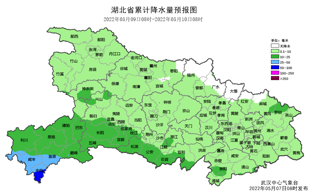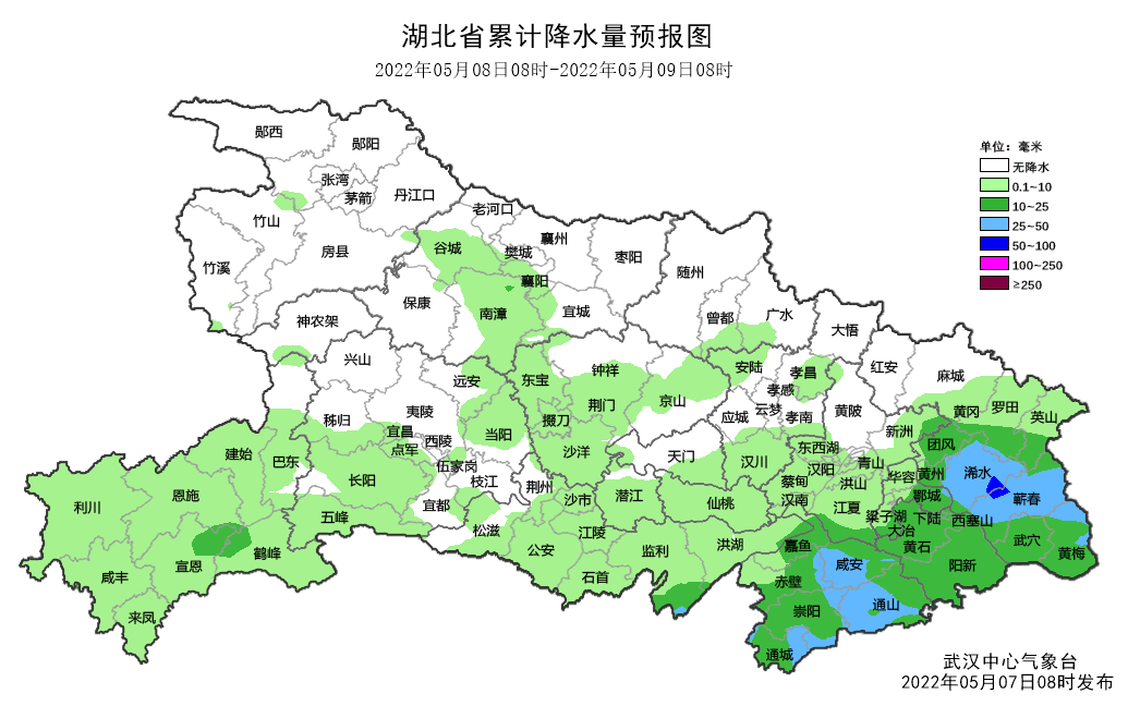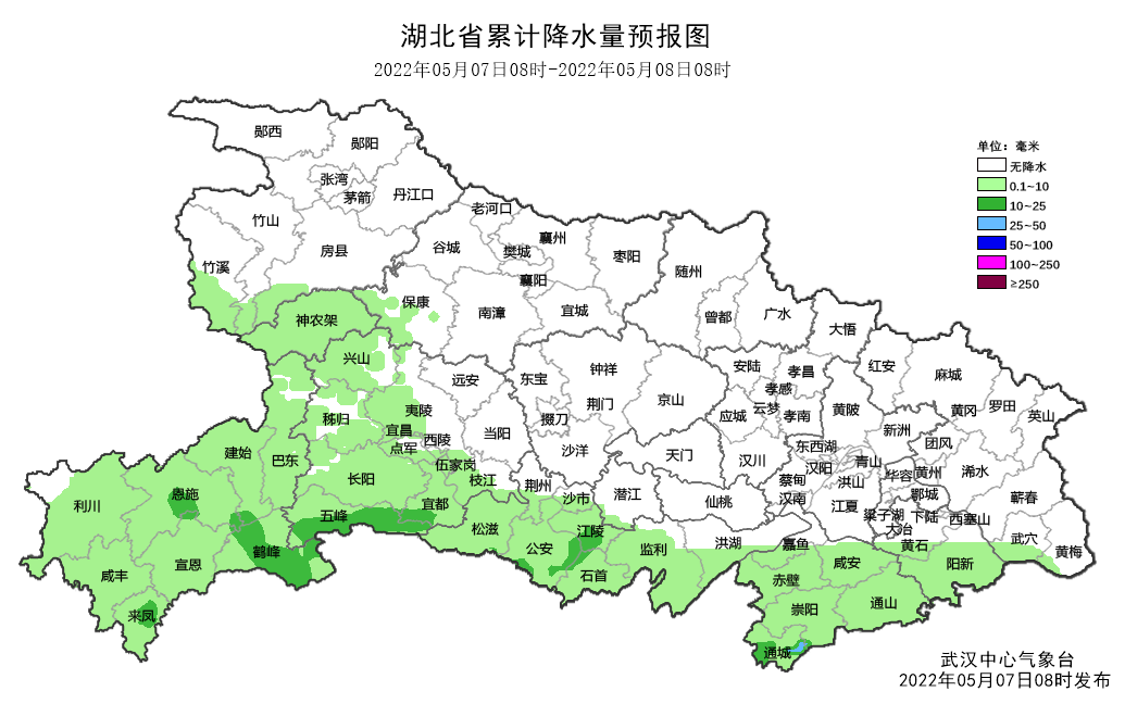 鄂西南、江汉平原南部、鄂东南、鄂东北东部阴天有小到中雨,局部大雨;其他地区阴天有小雨。