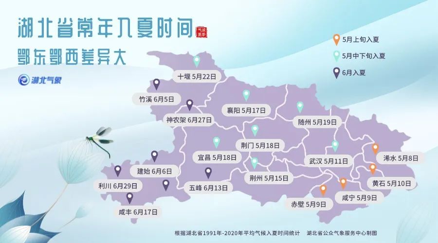 5日进入“立夏”节气,夏天越来越近了,湖北省常年夏季长度为139天,在四季长度中居首位。从近三十年气象观测数据来看(1991-2020年),全省常年平均入夏时间是5月19日,出夏时间是9月21日。近三十年,特别是20世纪90年代中后期及21世纪初,夏季长度明显偏长,其中1998年夏季时间最长,为153 天。