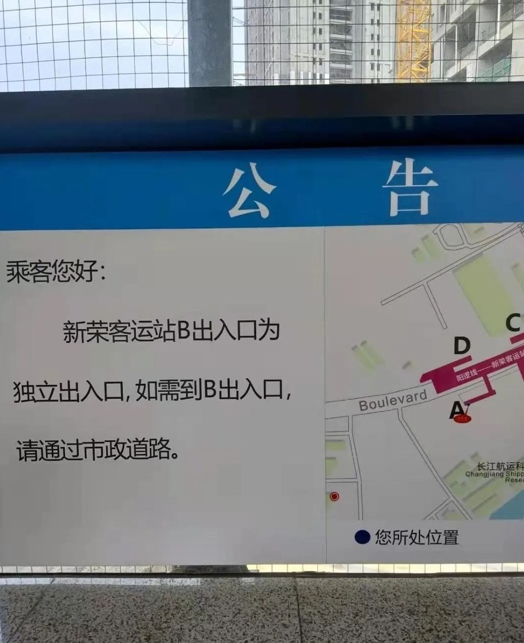 武汉地铁集团运营公司工作人员表示,考虑到今后换乘客流的影响,优先保障站内客流需求,21号线新荣客运站B出入口设计为独立出入口,未设置非付费区通道与其他出入口联通。车站A、B出入口处张贴了相关公告,对于无乘车需求的乘客,可通过市政道路通行。