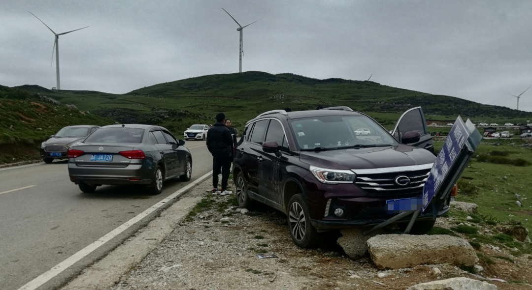 当天下午2点半左右,威宁县公安局交通警察大队七中队接指挥中心指令称在盐仓镇百草坪景区内发生一交通事故,有人受伤。民警到达现场后发现一辆车牌号为贵F3***7号小型普通客车前面受损,路边的警示牌被撞倒,伤者已送往医院。