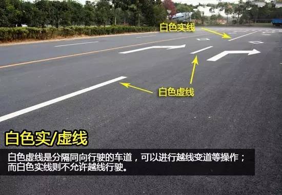 通常道路交通标线以白色居多,其中白色虚线是分隔同向行驶的车道,可以进行越线变道等操作;而白色实线则不允许越线行驶,常常作为白色虚线的延长线在交叉路口前出现,或是分隔路边的停车区域。