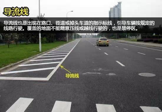导流线也是出现在路口、匝道或掉头车道的指示标线,引导车辆按规定的线路行驶。但很多驾驶人误以为这是停车区域,其实导流线覆盖的地面是不能轧线行驶的,也不能在区域内停车。