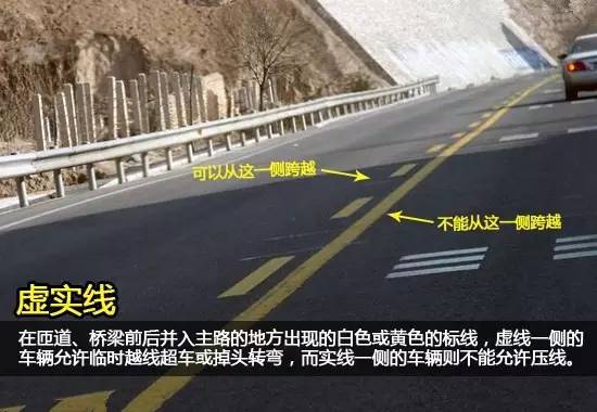 在匝道、桥梁前后并入主路的地方常常会出现白色或黄色的虚实线,虚线一侧的车辆允许临时越线超车或掉头转弯,而实线一侧的车辆则不允许轧线。