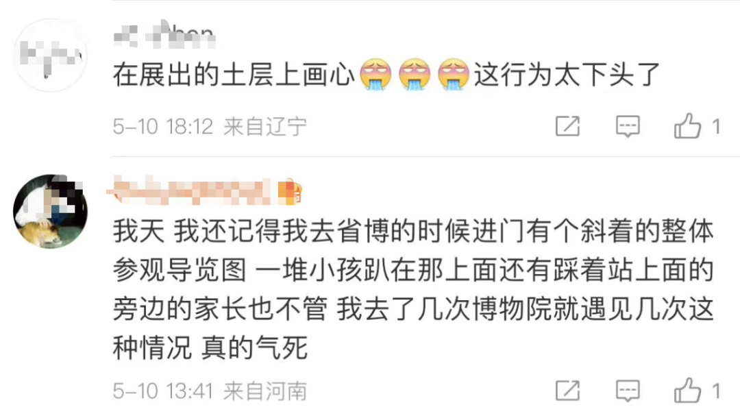 工作人员还表示,博物馆目前有安保人员进行巡查、劝阻,但因为游客较多,除了露在外面的土块外,还有很多互动设施也遭到严重破坏。