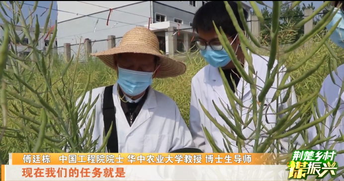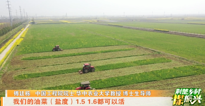 中国工程院院士、华中农业大学教授博士生导师 傅廷栋:“农民 一家一户地送种子给他种,我们团队安排了8个硕士、博士研究生,为有盐碱的地(方)做工作,它的特性,它的机理,还有筛选资源,筛选品种。”