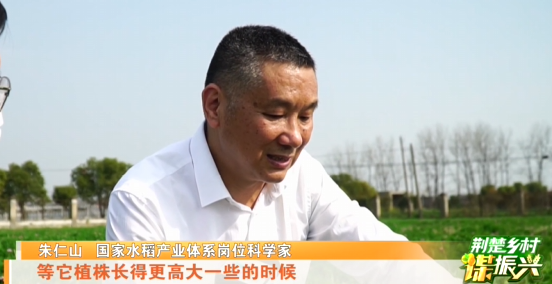 国家水稻产业体系岗位科学家 朱仁山:“这是一个很好的绿肥,生态高效 等它也植株长得更高大一些的时候,我们再用旋耕机把它翻耕过来腐烂,腐烂以后在田里面开展我们的品种试验。”