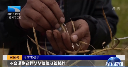 河南农机手司师傅:“熟透了,它很容易炸的。就像这样,你的手稍微搓一下,他直接就没有了,就光了。如果它稍微有一点露水,或者说阴天的话,最起码碰到它,不会说像这样随随便便就搞炸。”