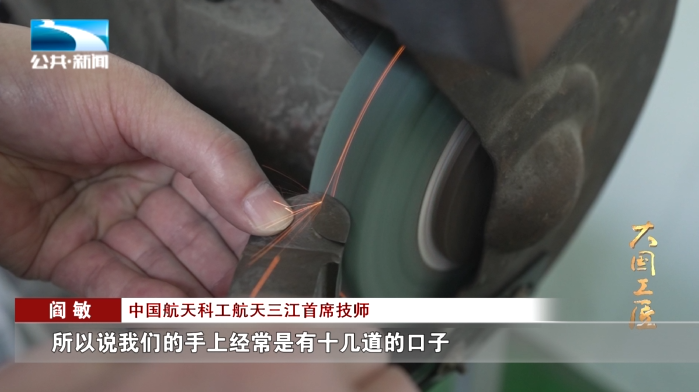 中国航天科工航天三江首席技师 阎敏:“别人磨一把刀、两把刀,我可能就要磨三把、四把,比别人成倍量地增加。所以说我们的手上经常是有十几道的口子,有新伤口,有旧伤口。”