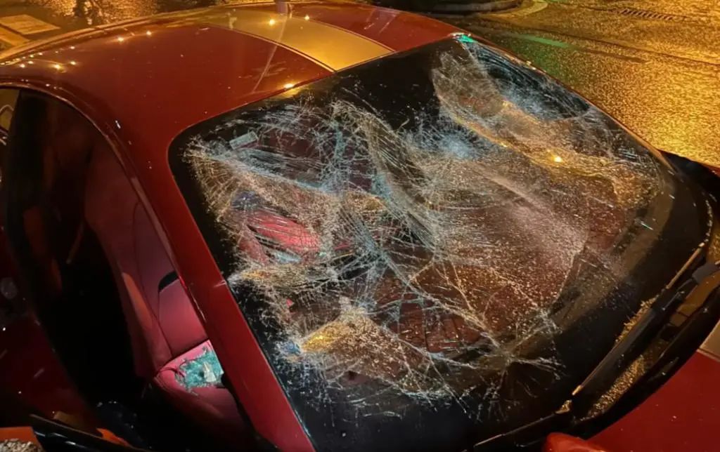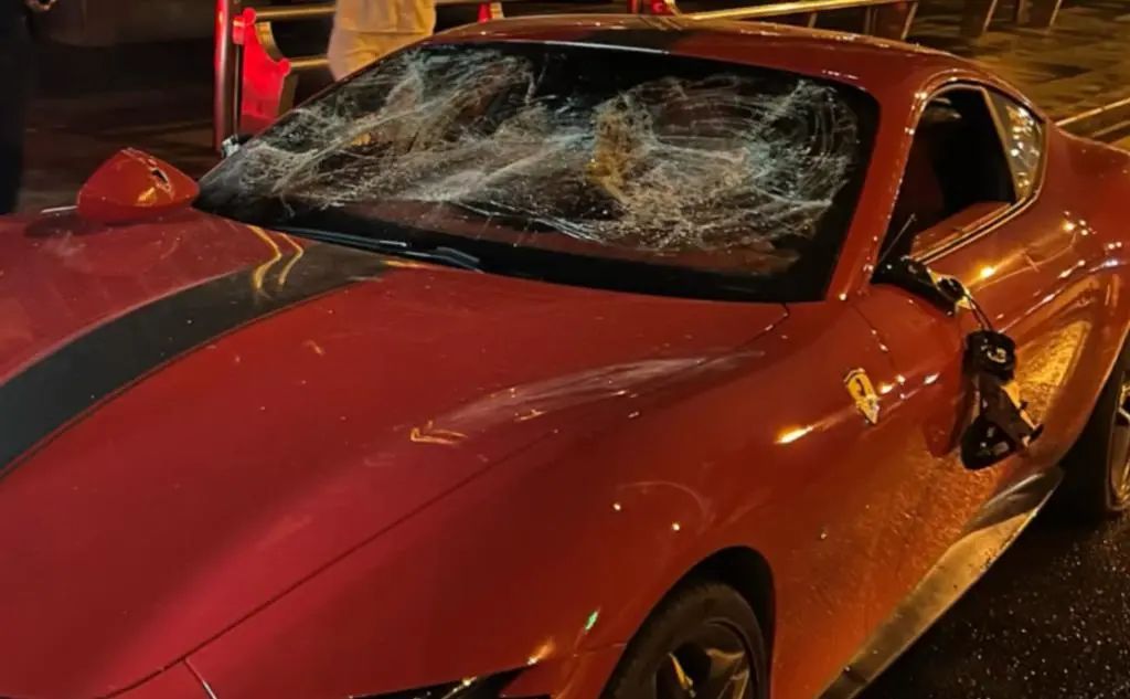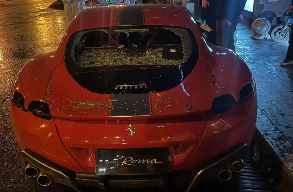 近日,湖南长沙。网传开福区万达广场附近," 一辆价值 350 万元的法拉利凌晨停路边被人恶意砸毁,车主称‘这顿夜宵值 100 多万’ "。