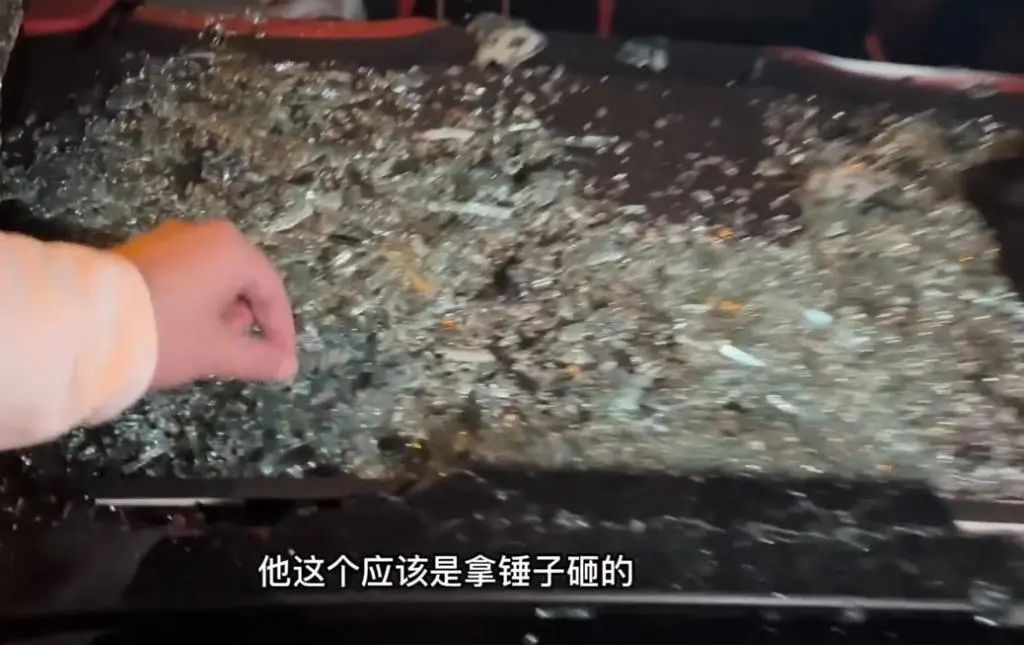 网传视频显示,车辆的前、后车窗玻璃均被砸碎,碎玻璃掉落车内,左、右两边后视镜也被砸落,掉在路边。