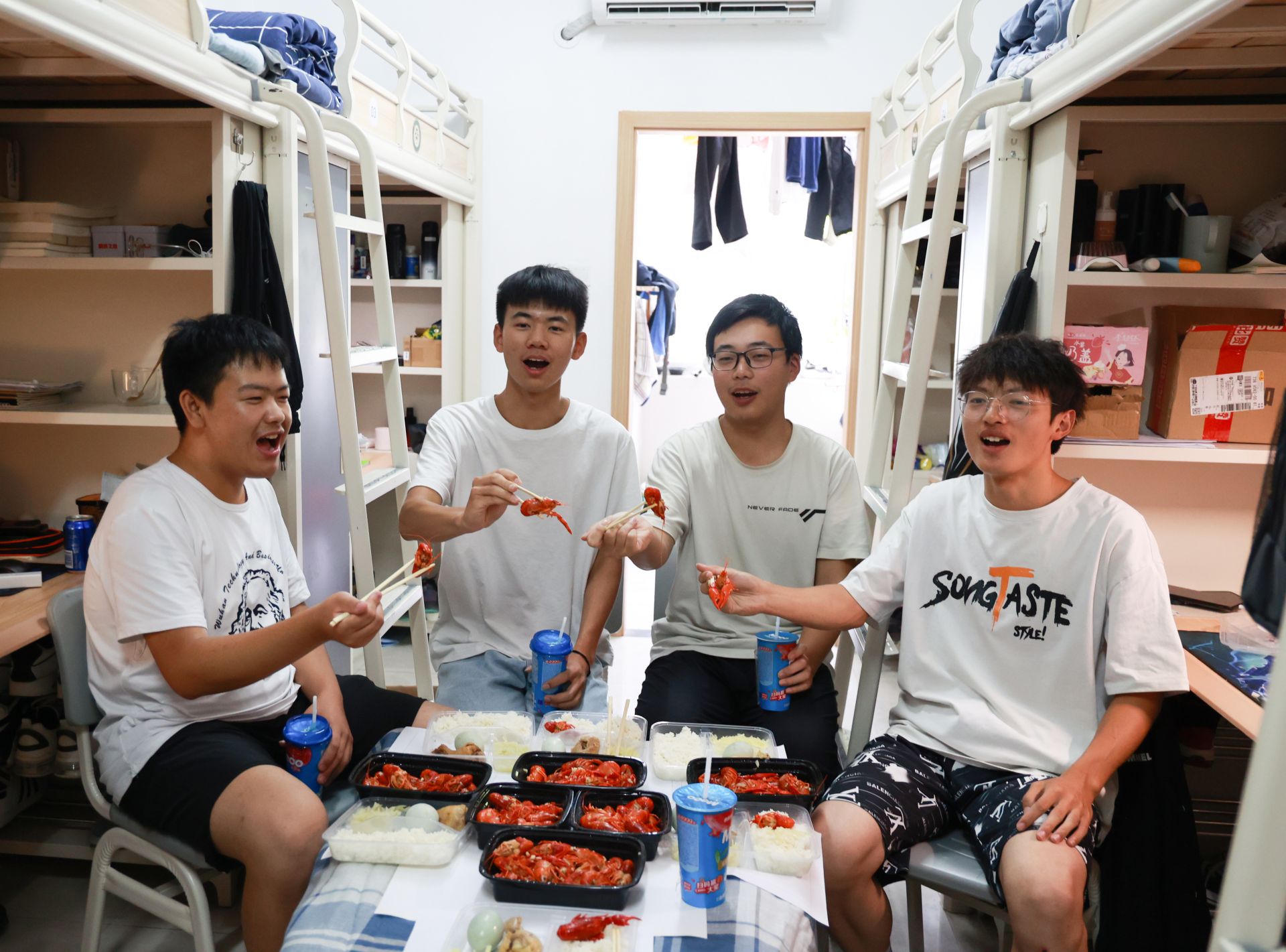 计算机与自动化学院大一学生赵骏超在寝室和室友们一起享用了丰盛校庆餐,他感慨地说,因为疫情武汉高校实行严格管理,好久没有回家了,学校在这个时候发放免费校庆餐真是暖胃又暖心。