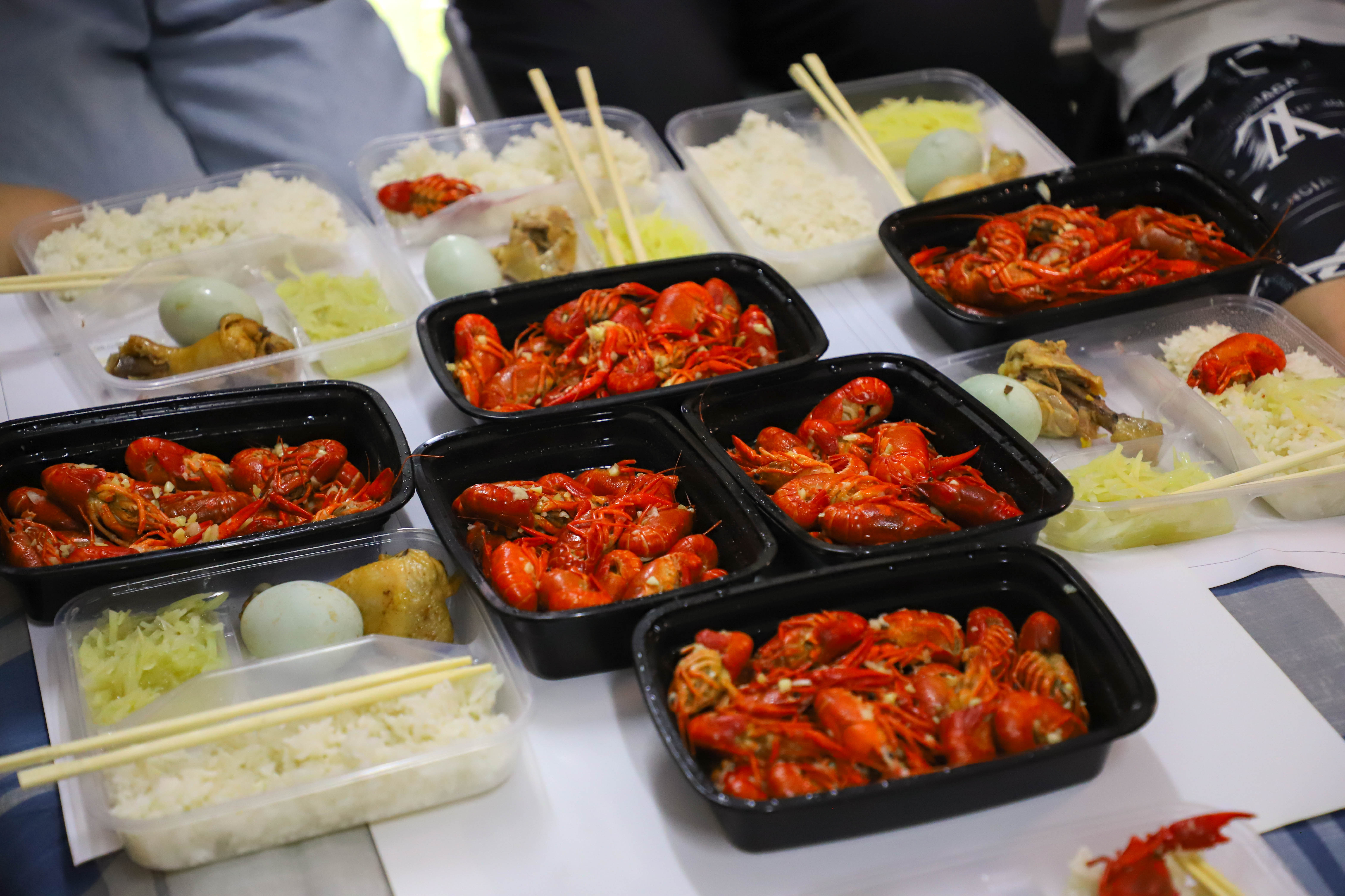 在学校食堂,工作人员告诉记者,每份校庆餐包括一份小龙虾,约有20只,一个大鸡腿,一份素菜外加一个咸鸭蛋,米饭也配了满满一大盒,保证每一位师生都可以吃好。