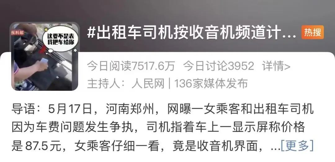 5月17日,一女士在郑州街头打的,结果出租车司机忽悠女乘客,说车上的收音机是计价器,要求乘客按照收音机上显示的电台频率“FM087.5”,支付87.5元车费。