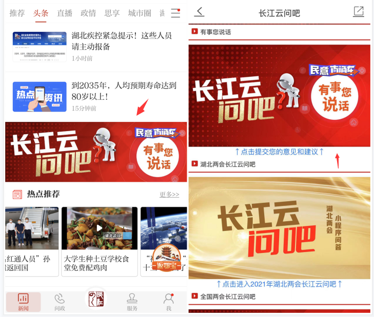 进入长江云头条频道,点击“长江云问吧”专题入口,选择“民意直通车,有事您请说”平台。
