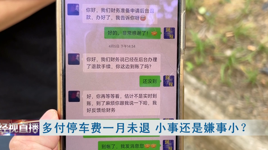 胡先生当场就联系了小区物业公司,对方表示可以退款,不过要等。然而一个多月过去了,还是没等来退款,胡先生寻思天天通过微信催也不是办法,5月20日,他专门开车又来了一趟。