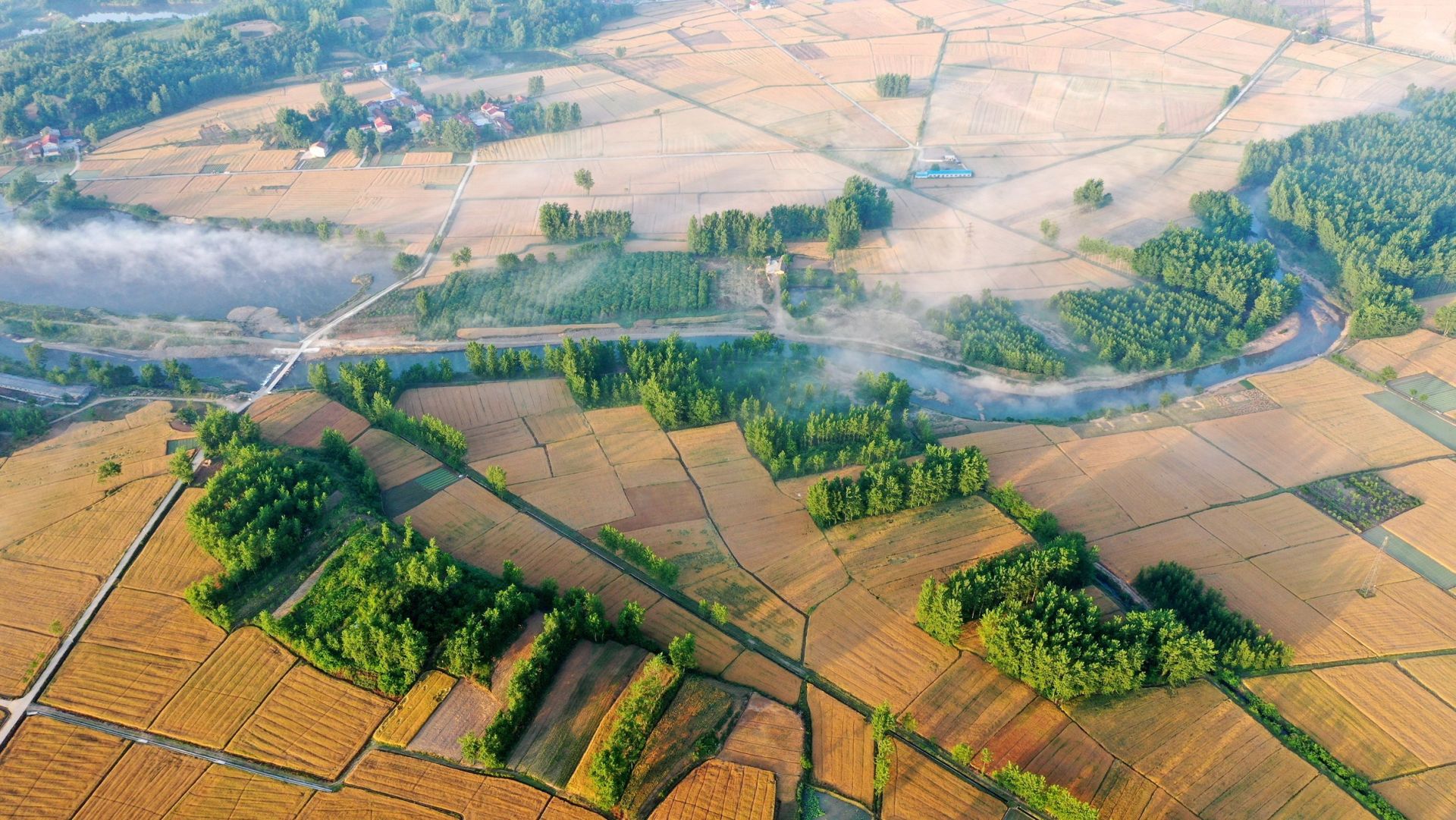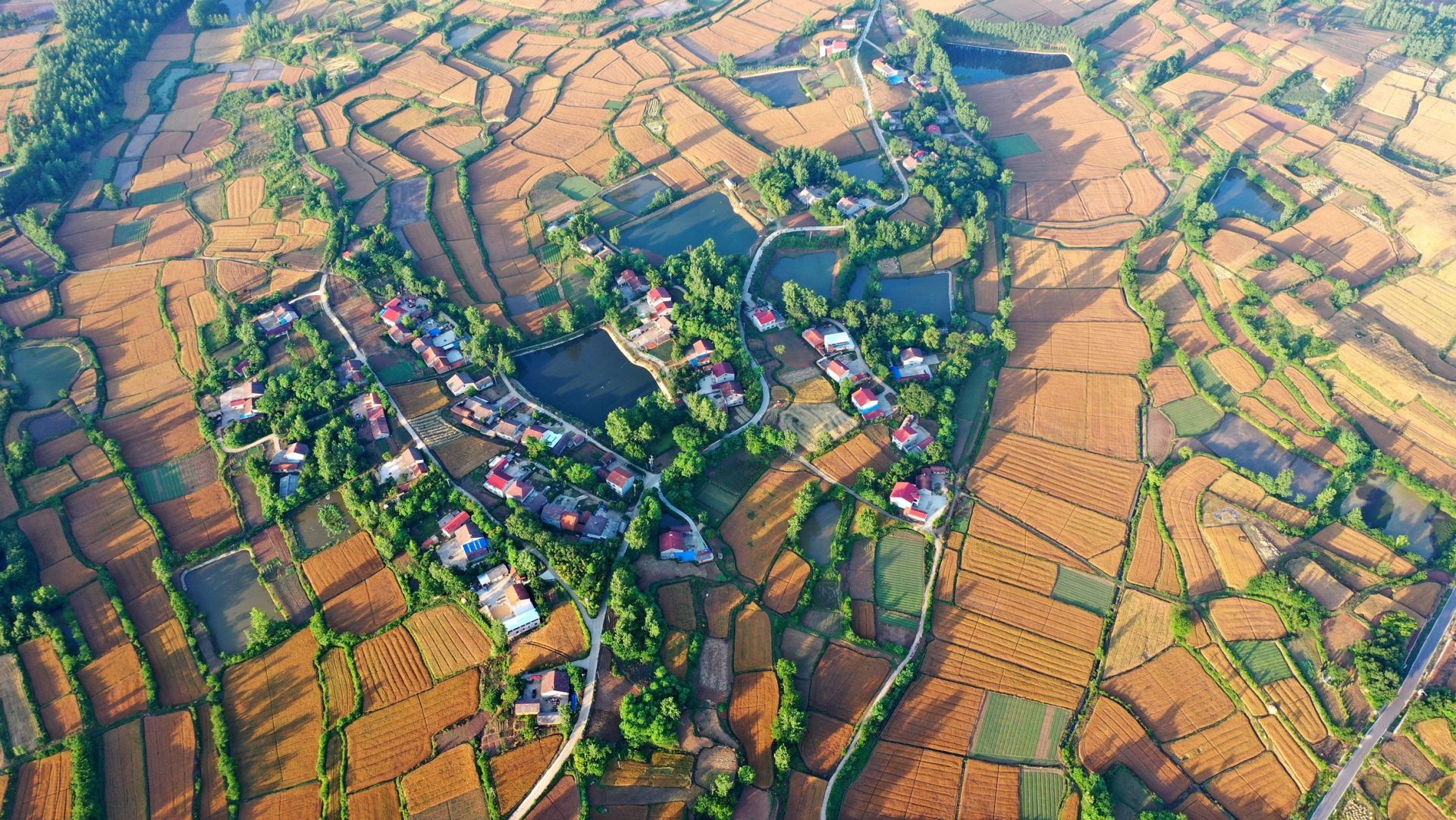 金色的麦田,环抱着美丽的村庄,与白墙红瓦的民居交相辉映,展现出一幅美丽的乡村田园风光图。