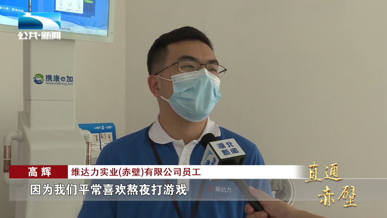 维达力实业(赤壁)有限公司员工 高辉:“因为我们平常喜欢熬夜打游戏,我对我的健康健康情况进行了自我检测,发现自己是中风险,我就自我调节,少食少盐,加强锻炼,慢慢我就从中风险走向了低风险。”
