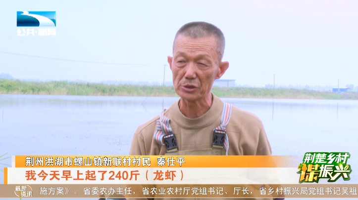 荆州洪湖市螺山镇新联村村民 秦仕平:“你看我这个虾,都是6钱以上的,像这样的虾拿到市场上可以卖20块一斤,我今天早上起了240斤龙虾,跟去年同期相比翻了两三番,我今年大概一亩田可能要突破一万,我们养殖户很高兴。”
