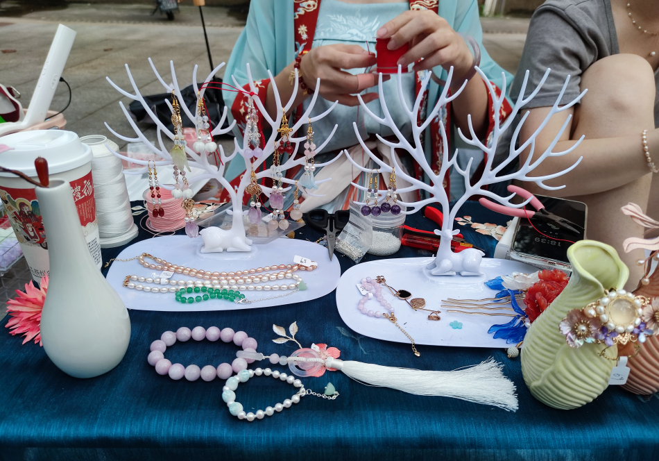 随性摆摊无人售货、疯狂吆喝热情推销、现场弹唱吸引注意……各个摊位各显神通。在众多出售闲置的摊位中,有一个格外引人注目,一位身着汉服和一位身着改良旗袍的学生正现场制作古风饰品。她们摊位摆出的都是手工制作的饰品,如发簪、耳环、手链等。“我们是汉服爱好者,出于兴趣我们一直都有手工制作一些饰品。”身着汉服的李彩珍是外语学院的大三学生,她介绍,“希望通过这次摆摊,出售一些闲置饰品的同时,传播我们优秀的传统文化。”身着旗袍的甄宏然是资源与环境学院的毕业生,在旁边现场展示制作了一对耳环。