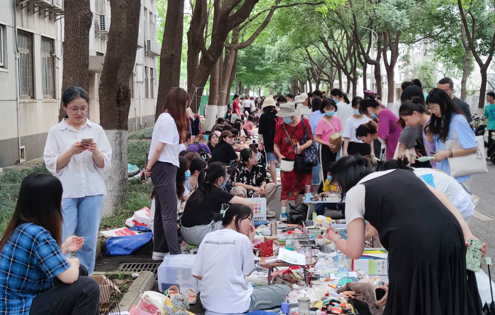 门类众多的书籍和笔记、精致可爱的挂件或玩偶、高效学习或幸福生活的特别物件……各个摊位前商品琳琅满目,现场人头攒动,叫卖声、交易声、砍价声此起彼伏。