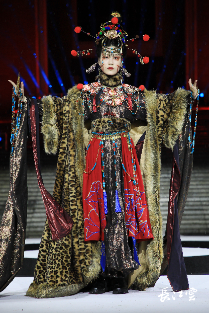 毕业生陈嘉怡的演艺服装设计作品《一天云烟》裁剪利落,配色经典,设计者结合中国传统戏曲元素和西藏地区服饰文化特色,对昆仑神话角色进行了大胆创新,不一样的神话形象让人物角色设定更加鲜明贴切。“这套戏服的设计非常用心,从花纹到配件都体现出了角色端庄霸气的一面。我作为模特一穿上这套衣服就立刻感受到了角色的气息,演绎起来也更加自信。”当晚参与该套服饰表演的19级服饰表演与推广方向学生吉歆雨介绍说。