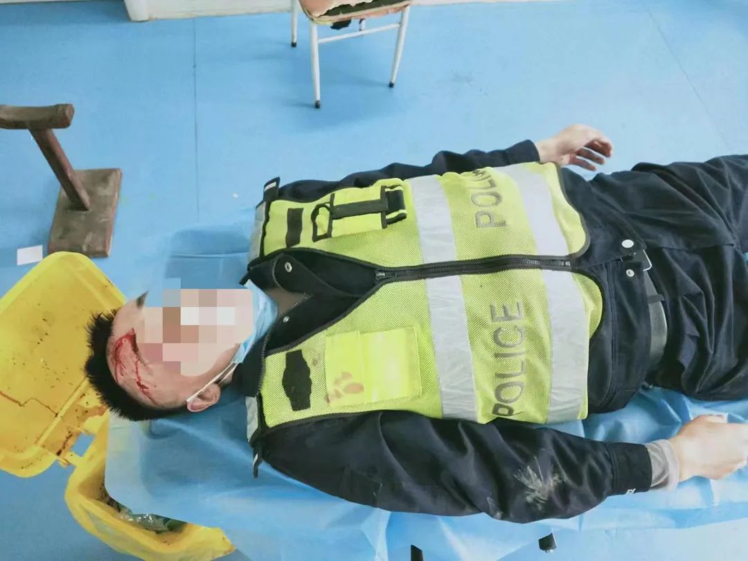 一名执勤民警被撞倒在地受伤,鲜血直流,但驾驶人仍不管不顾,继续往前“冲”,最终撞上一辆停驶的红色小车才被迫停下。
