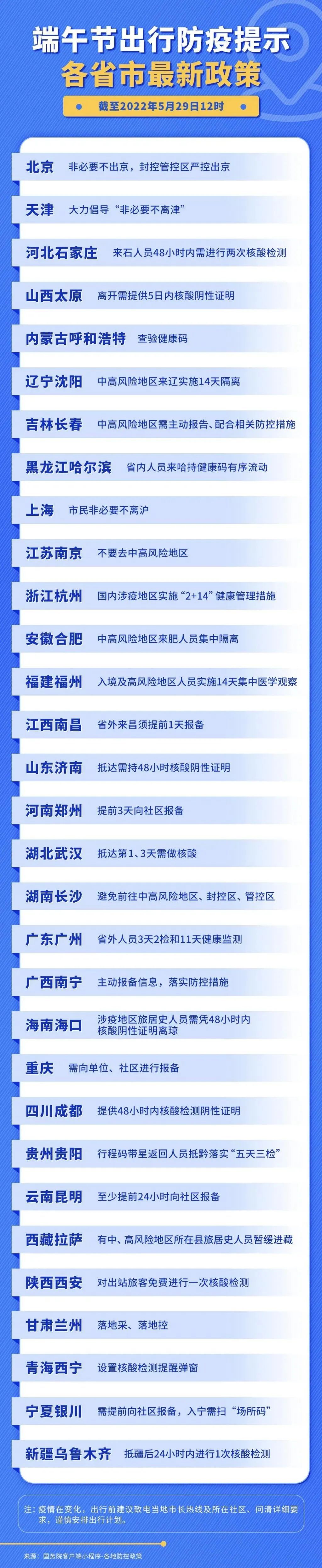 人民日报健康客户端梳理了截至2022年5月29日12时各省市防疫政策汇总,供大家参考,最终以当地发布情况为准。